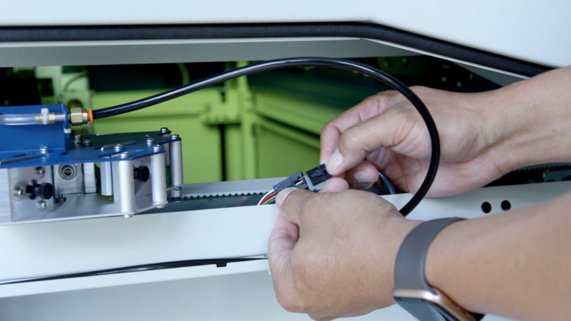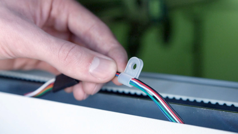 Use a 5/16” nut driver to remove the plastic clamp holding the sensor wires down in the track running alongside the y-axis.