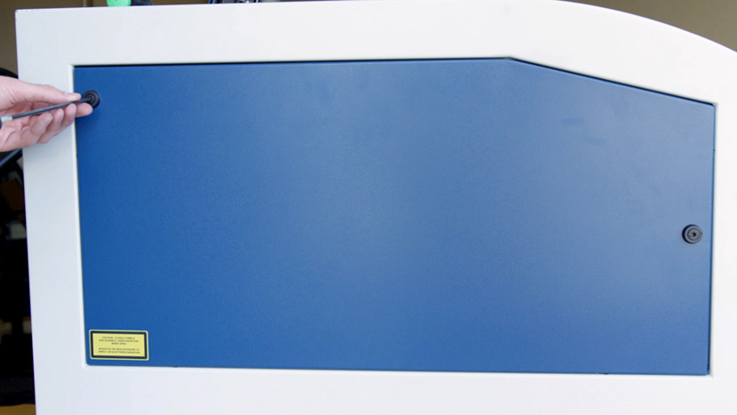 Remove the top access panel on the left side of the machine by using a 5/32” hex key to turn the black panel locks ¾ of the way counter-clockwise.