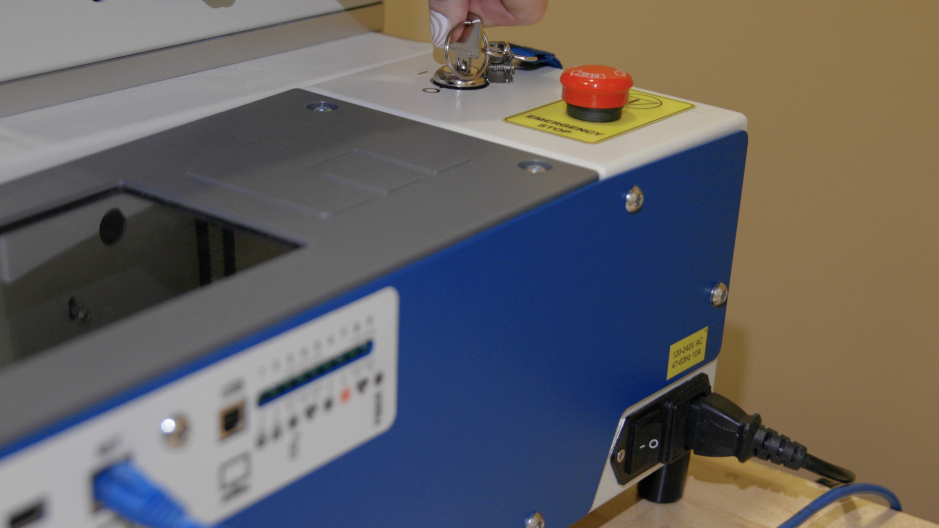 For the Fusion Pro 48 and Fusion Galvo G100, there’s an additional key to turn on the machine. This key also helps restrict access to the system. Ensure it’s in the ‘on’ position.