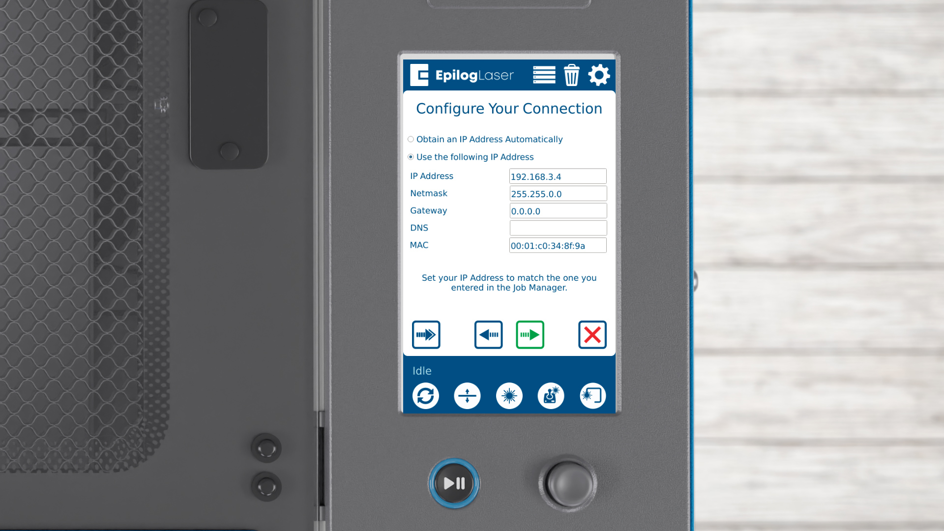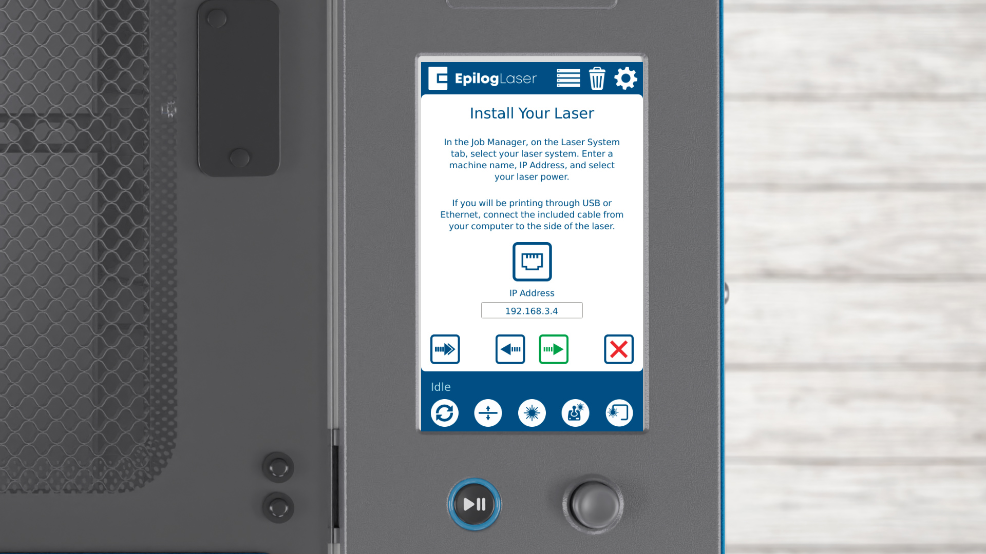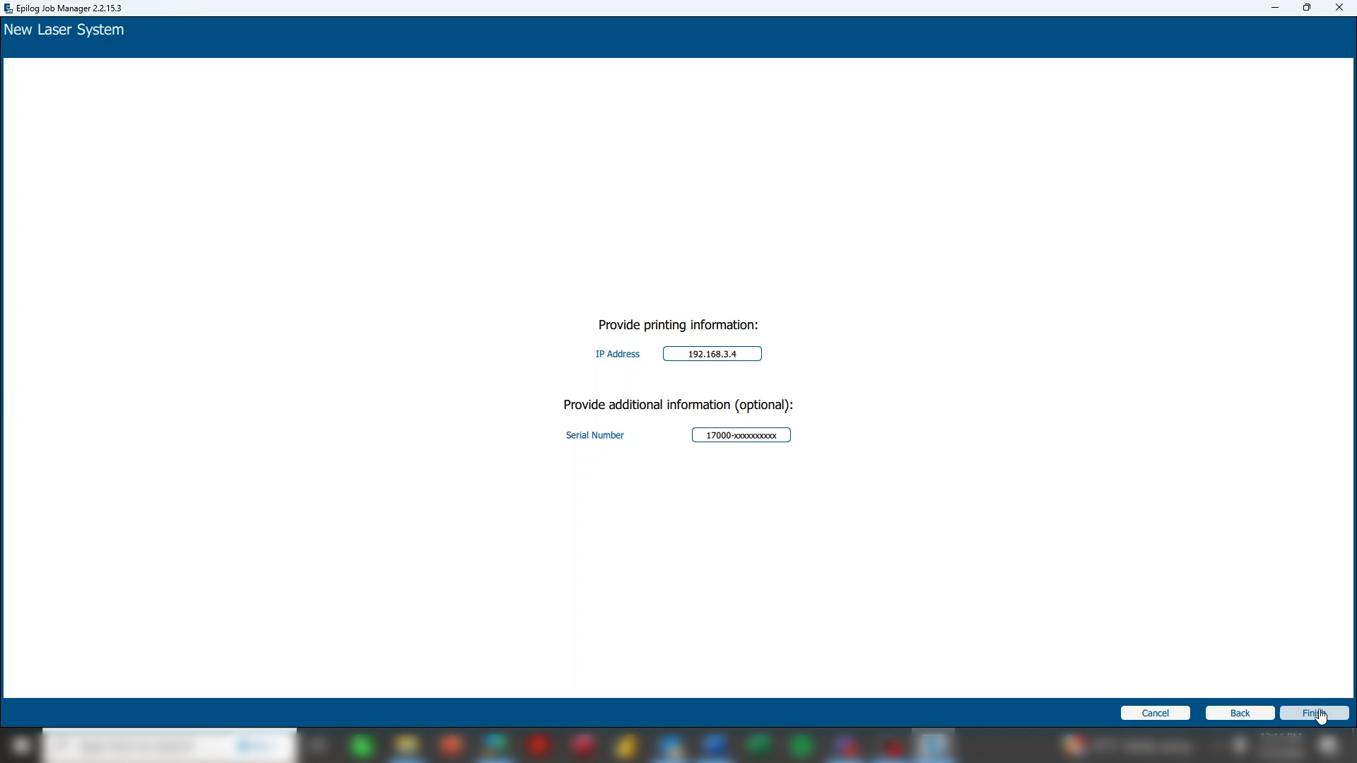 Then type in the IP address that is on the display panel of the laser. You can also enter your Serial Number for future reference or add this later.