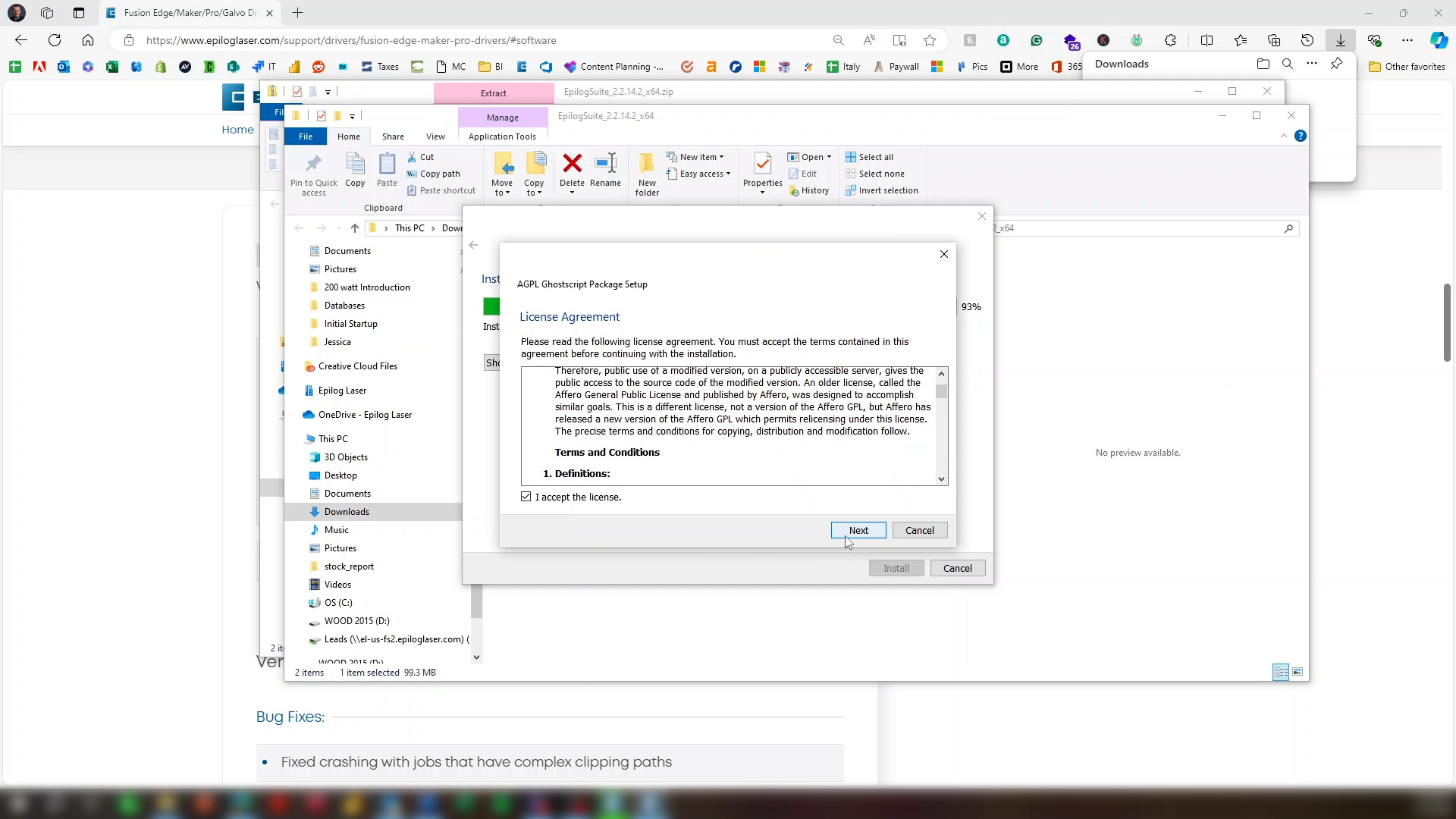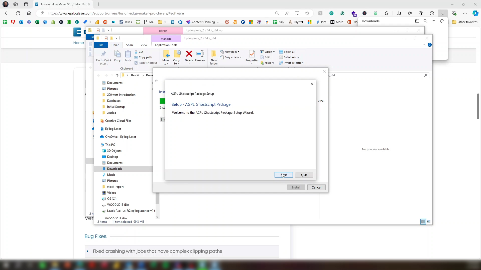 Once your connection is set up, the wizard will prompt you to install the Epilog Software Suite. Press the arrow to continue.