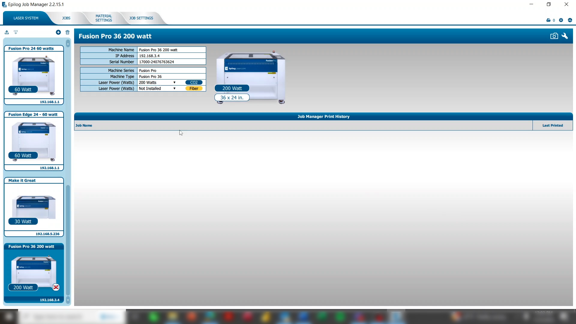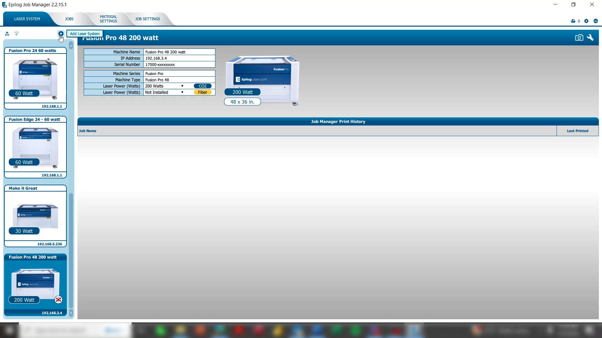 Now you can see your laser system has been added to your machine list with the IP address, wattage, and other information easily accessed.