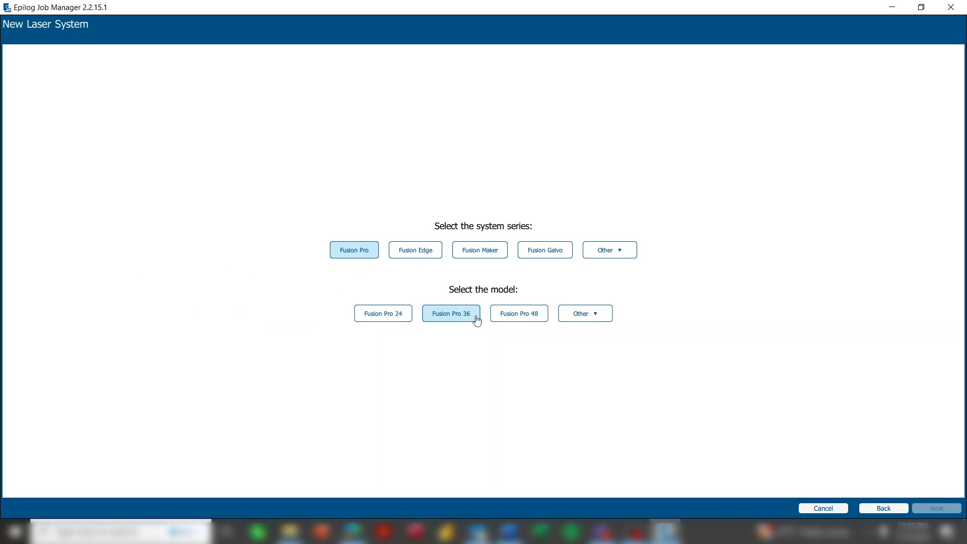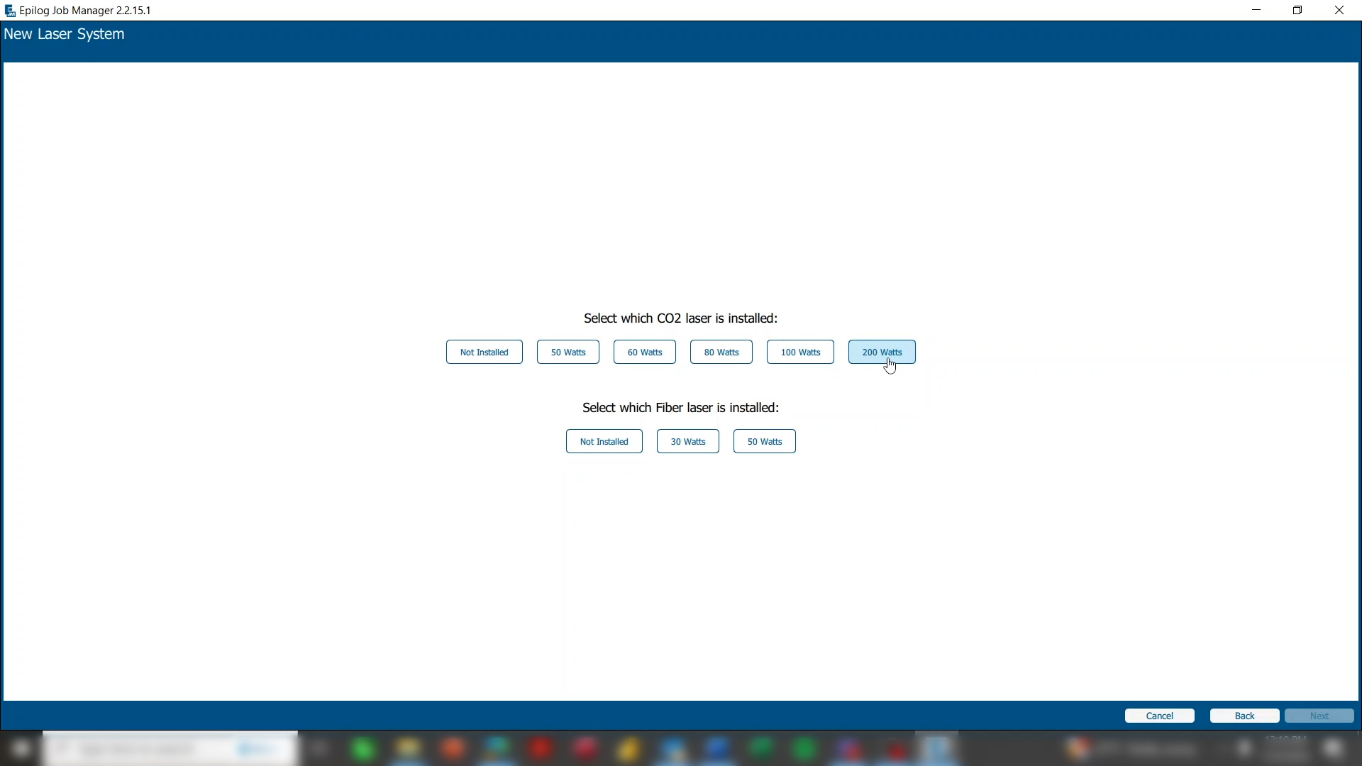 After installation, the Job Manager will open, and you’re ready to add your laser system. On the Laser System tab, click the plus button to add a laser system.