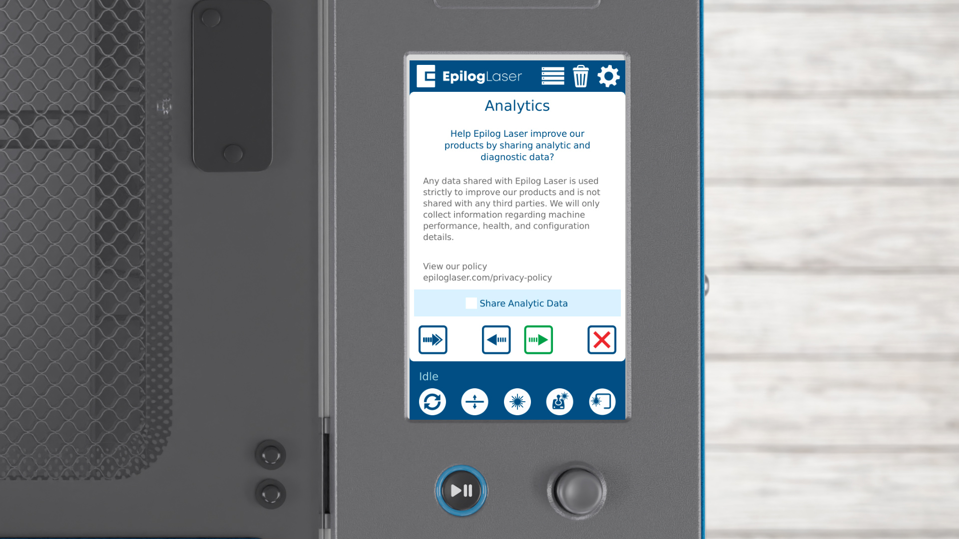 You can choose to opt-in for sharing analytics data with Epilog, which helps improve future software updates. Click the arrow to continue.