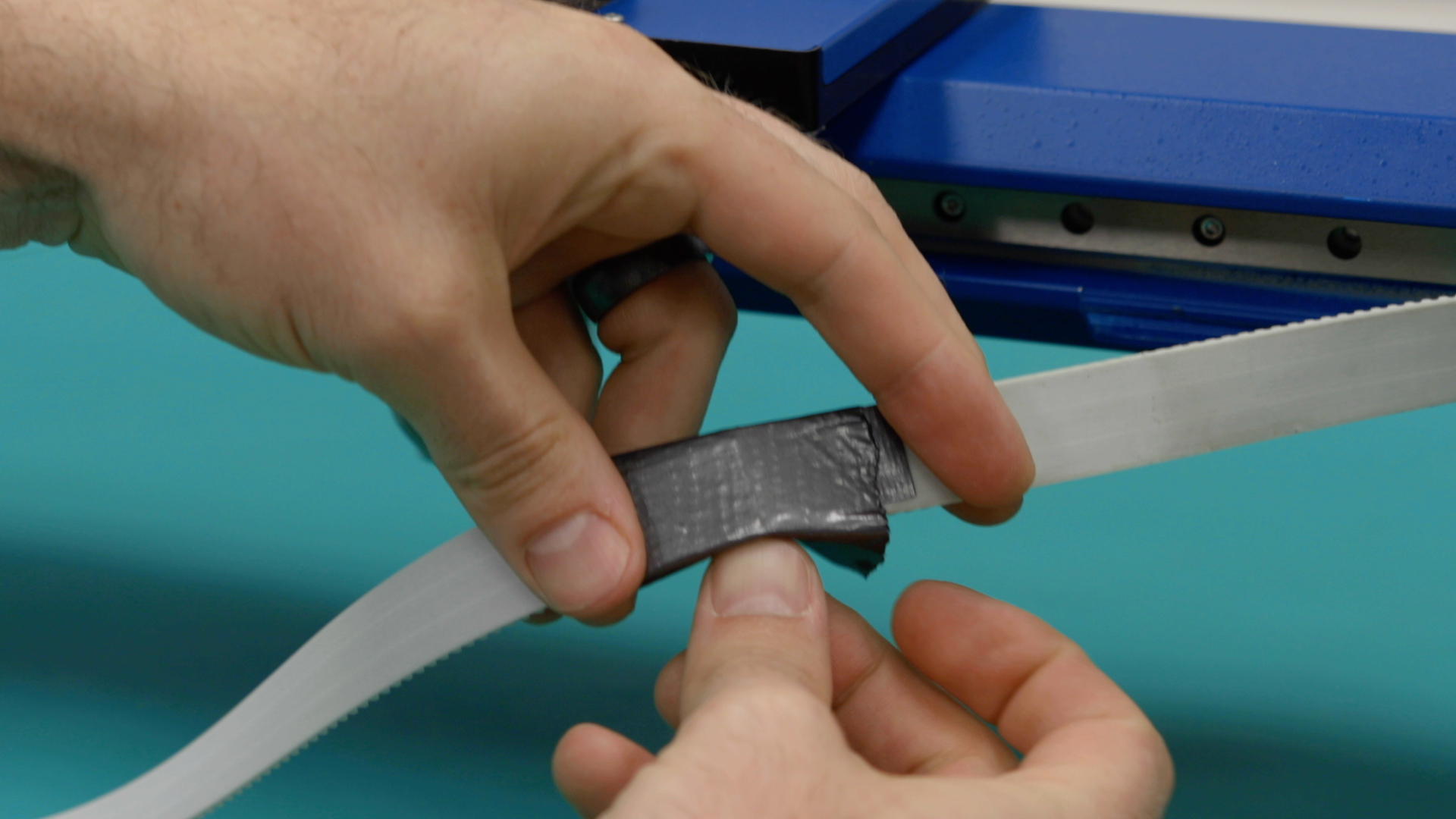 Once the new and old belts have been joined together, attach the right-side belt clamp to the untaped side of the new belt. This will prevent the new belt from being pulled into the reducer housing.