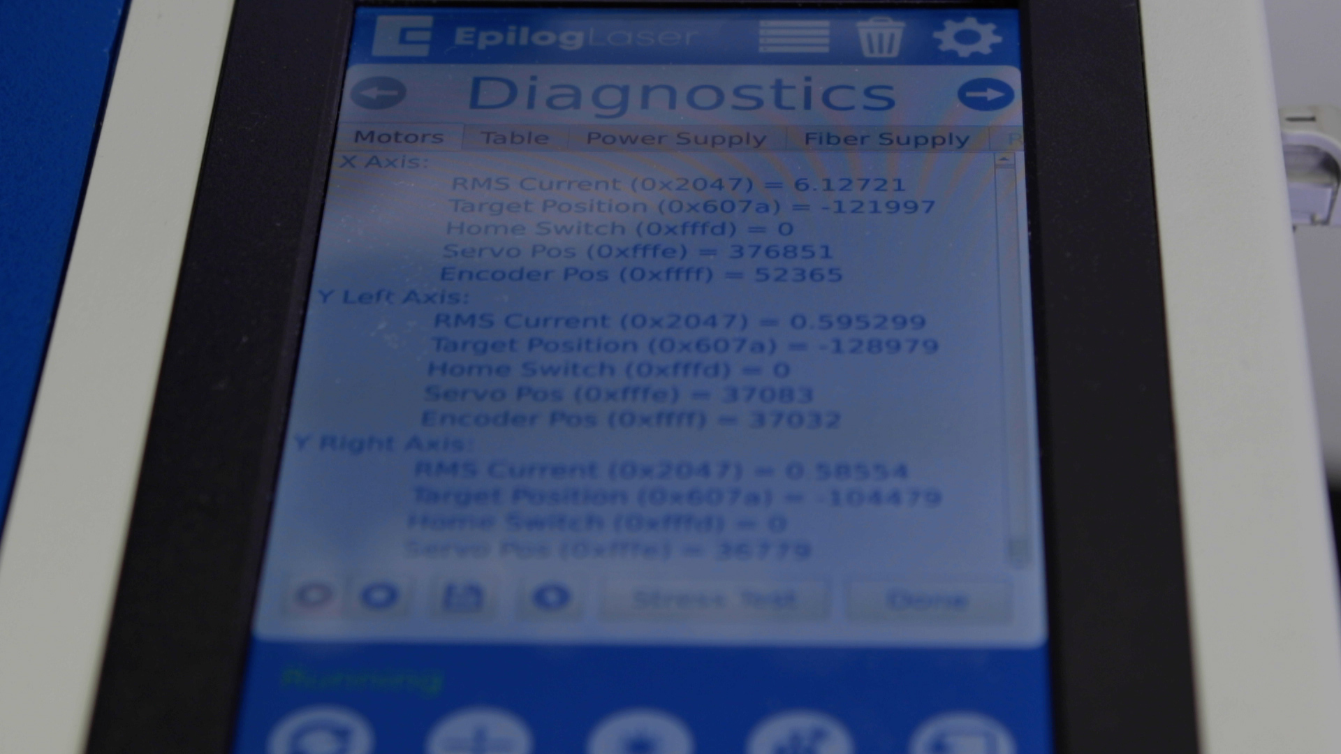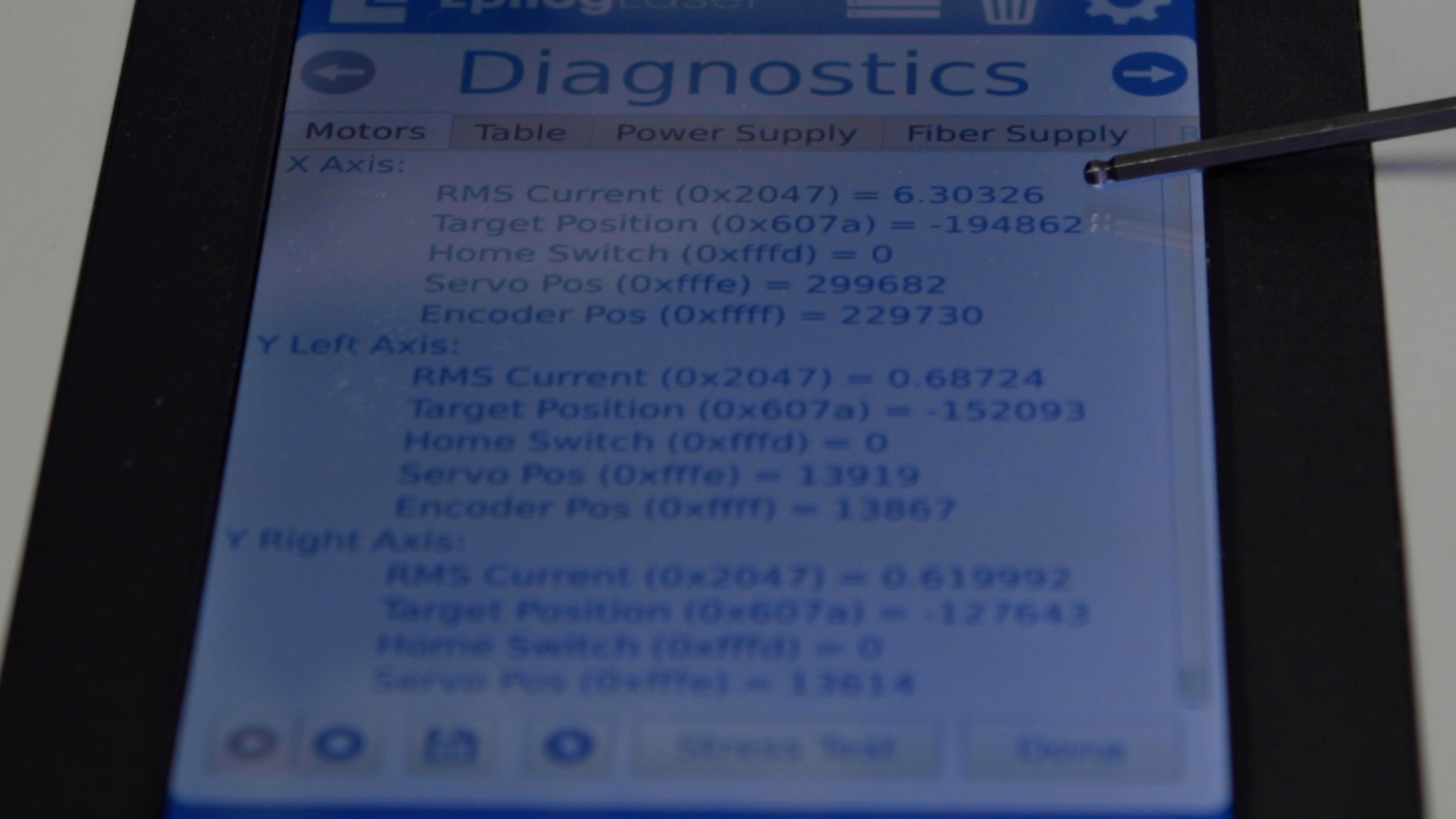If the RMS current is higher than this, pause the job and decrease the tension on the x-axis belt by loosening the two (2) 7/64” tensioner screws on the x-axis idler assembly.