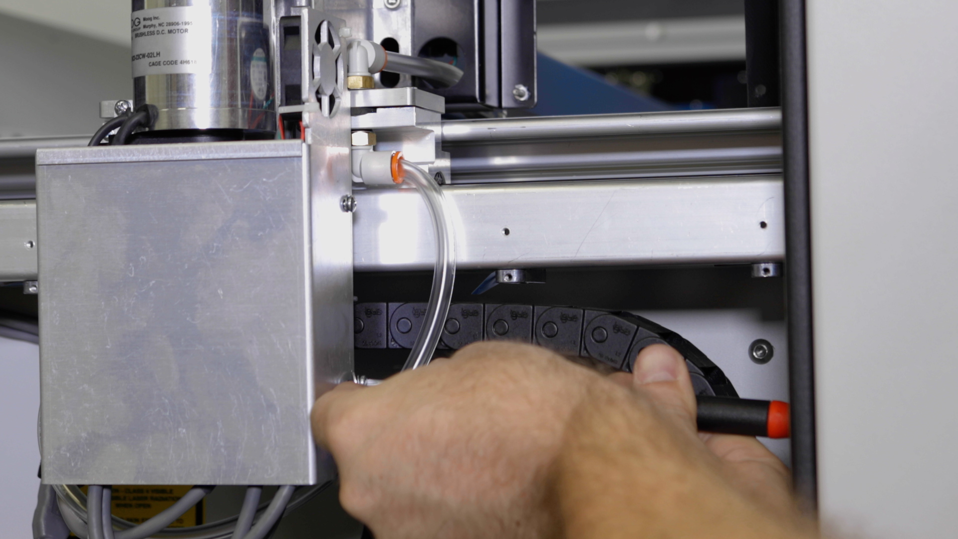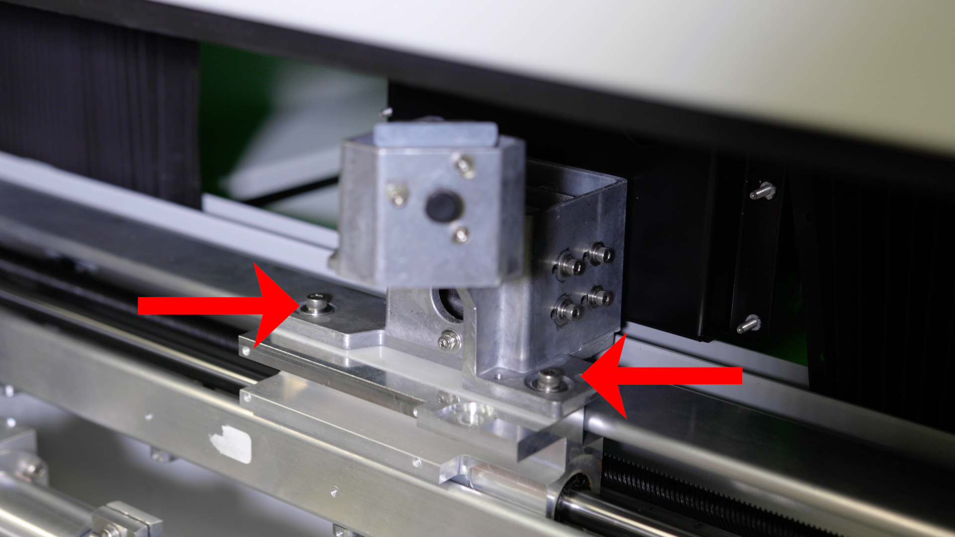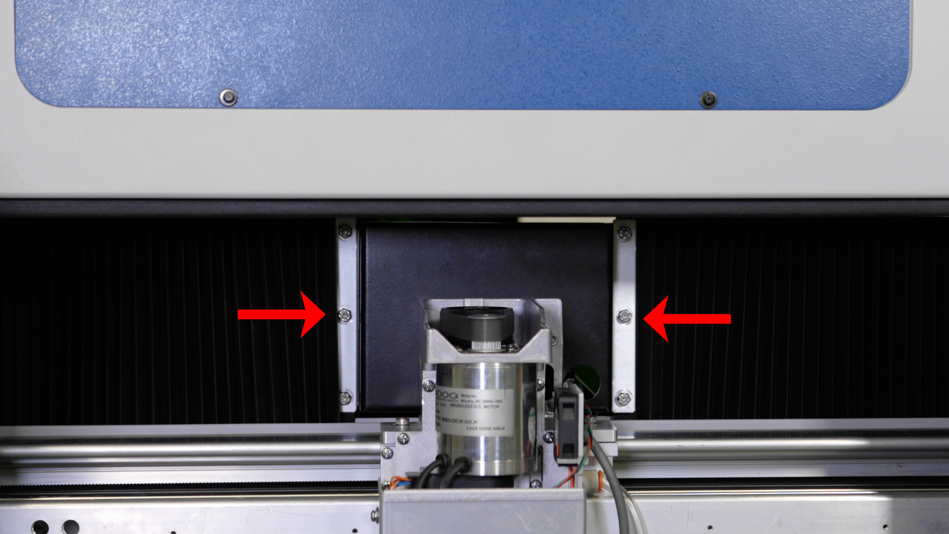 Install and/or tighten the four 5/32” fasteners that secure the x-axis assembly to the y-axis bearings. There are two on the right side and two on the left side.