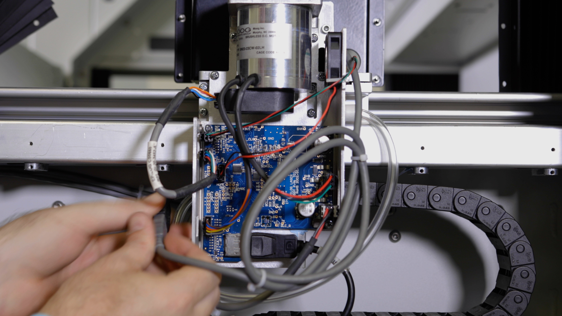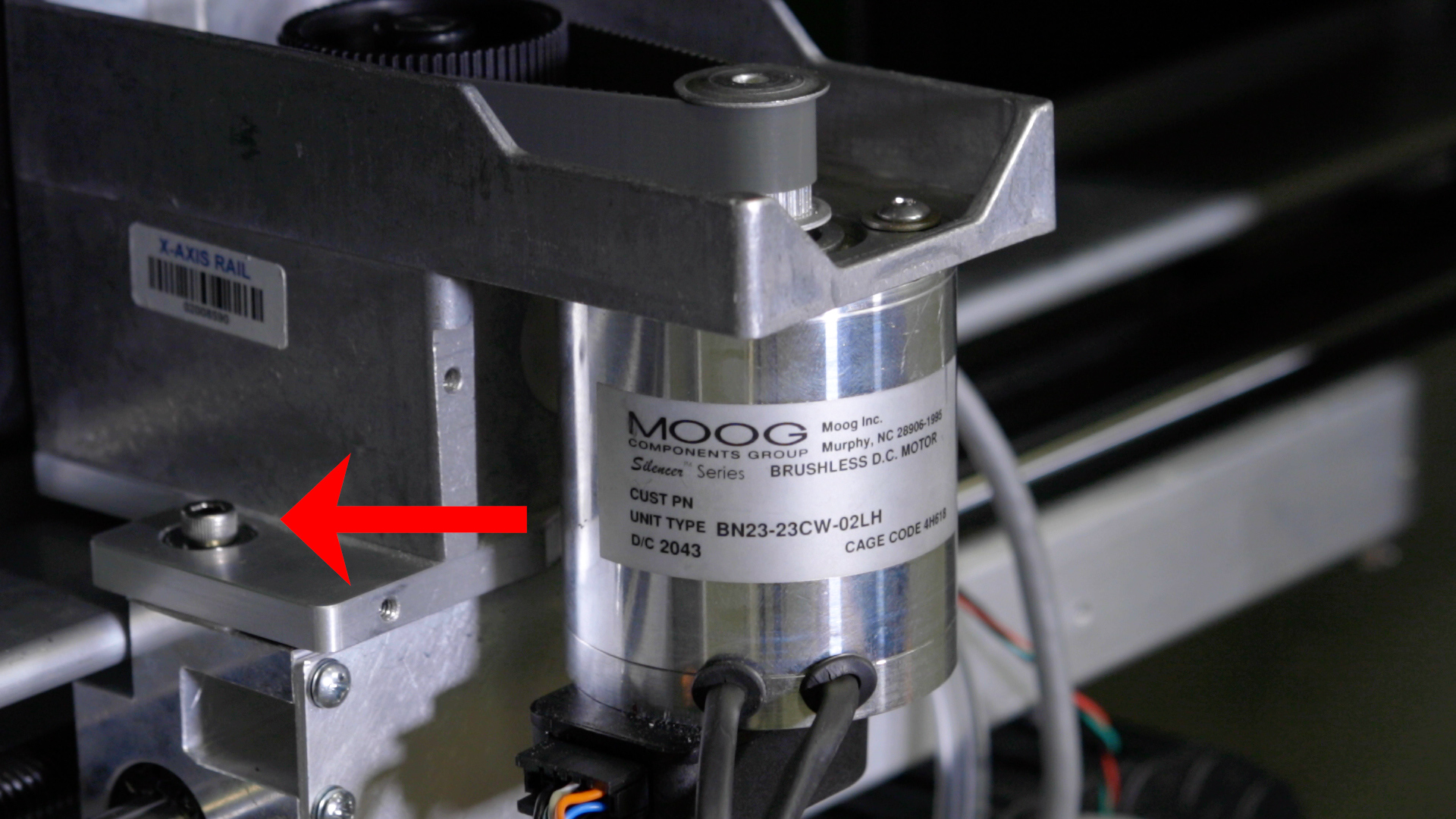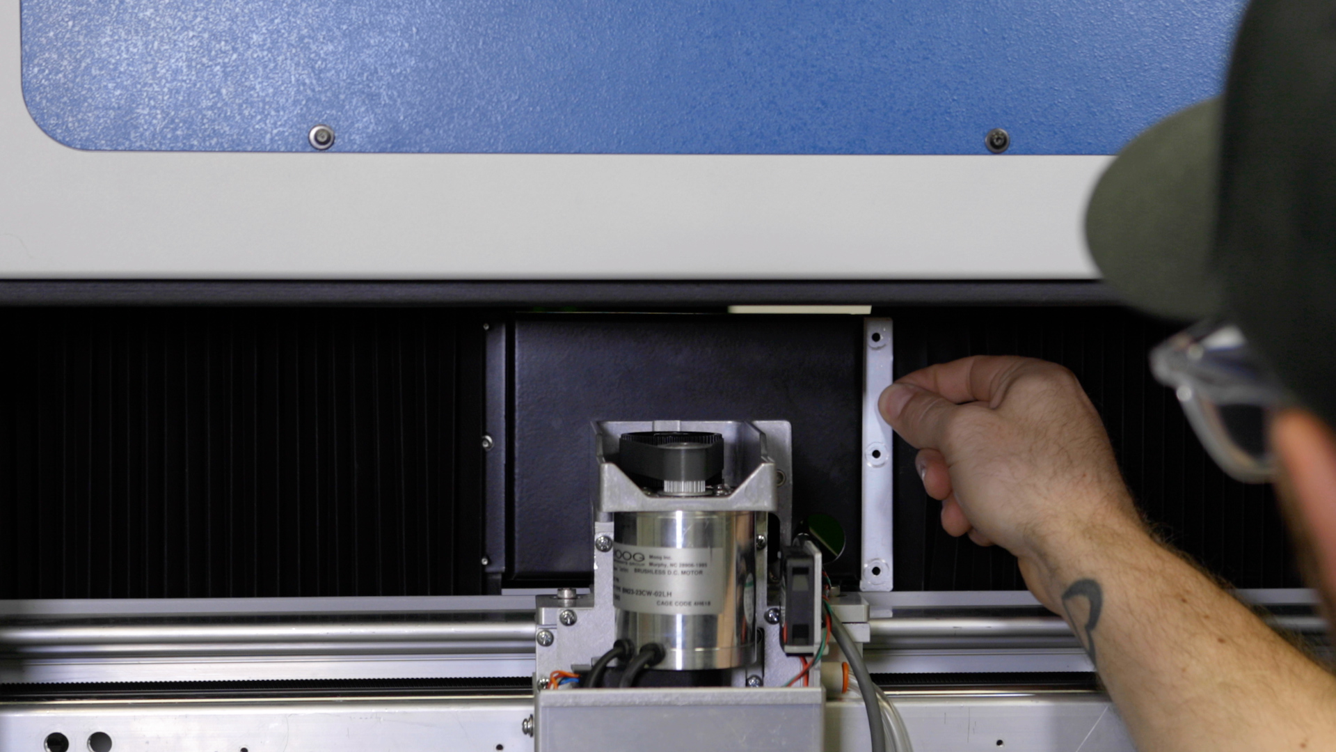 Install and/or tighten the four 5/32” fasteners that secure the x-axis assembly to the y-axis bearings. There are two on the right side and two on the left side.