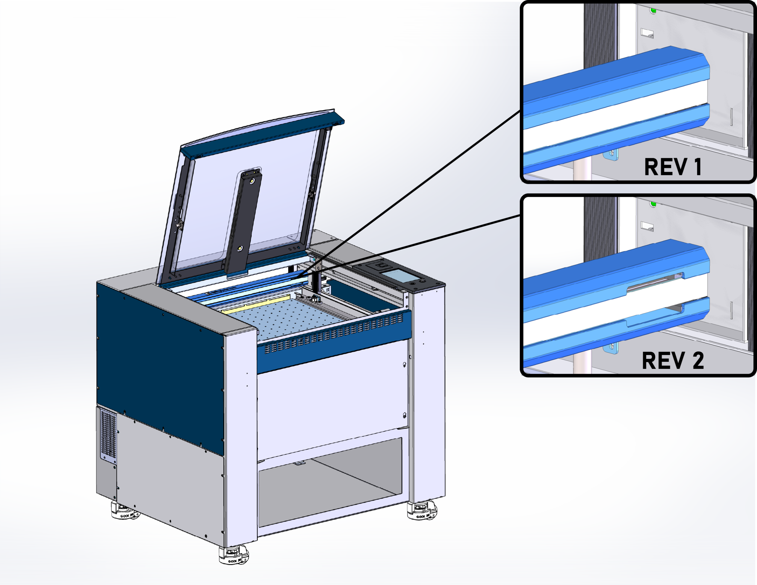 Before you begin, determine which version of the X-Axis rail is installed in your machine. Check the right side of the X-Axis rail: if there is no cutout, you have Revision 1; if there is a cutout, you have Revision 2. Follow the corresponding procedure based on this identification.
