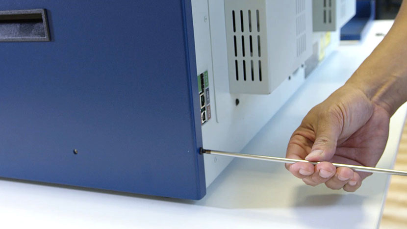 Replace the right side panel, inserting the four screws on the panel’s main face, as well as the two screws on the back.
