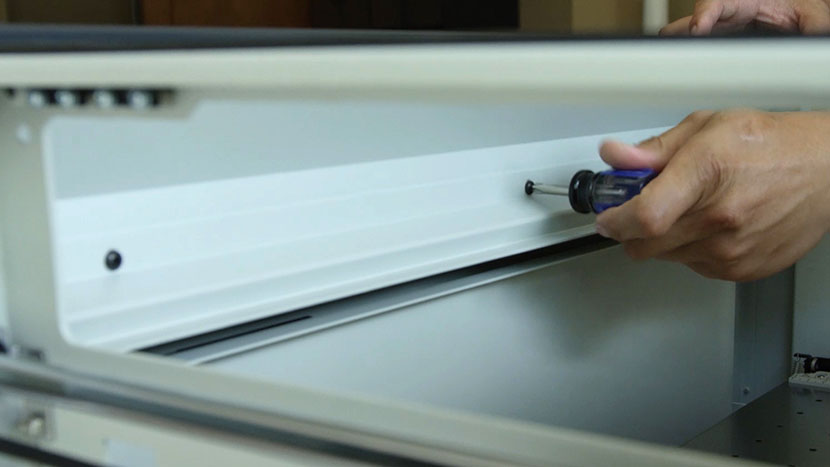 Install the bottom panel by affixing it to the two bottom nuts. Insert the three center screws to secure both panels.