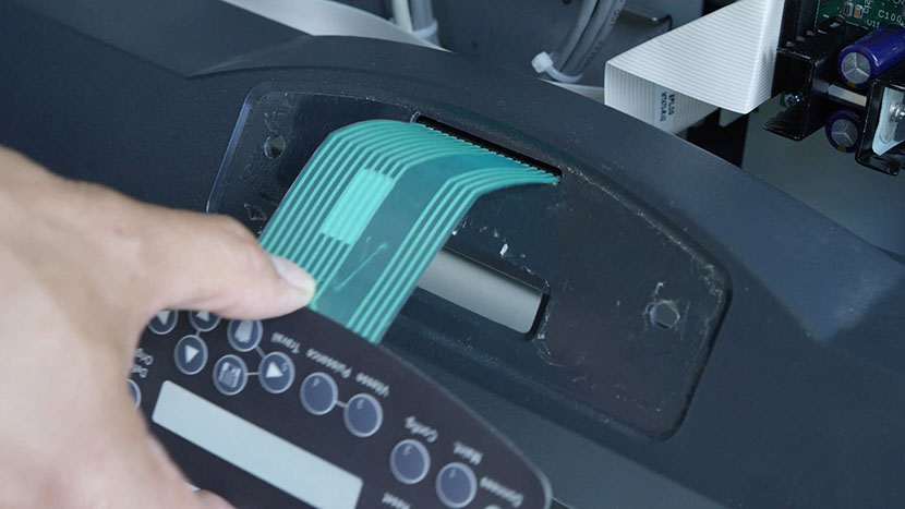Install the new keypad by sliding the connector through the top bezel slot and pressing the keyboard’s adhesive back to the recess in the bezel.