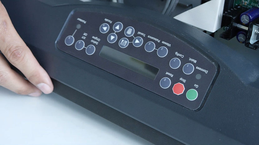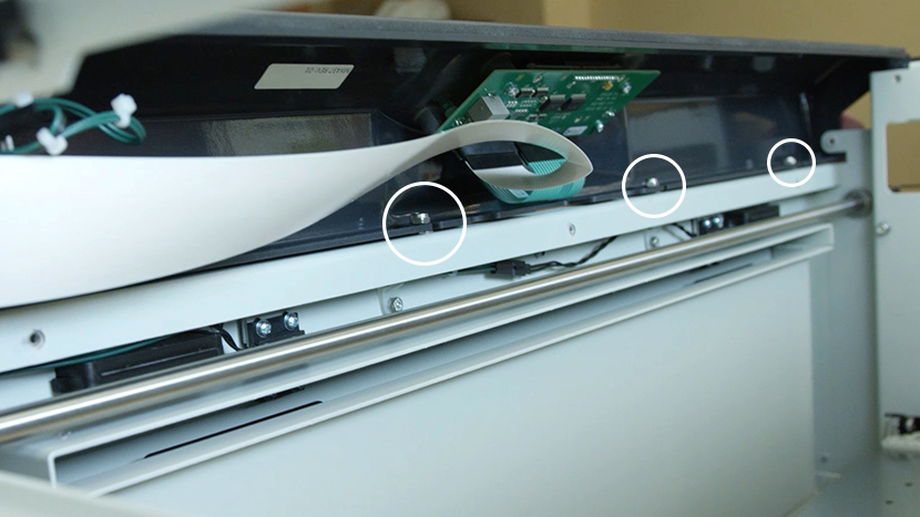 Loosen the four nuts using a socket wrench, then remove the bezel by sliding it out from under the screws, away from the machine.