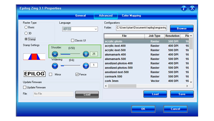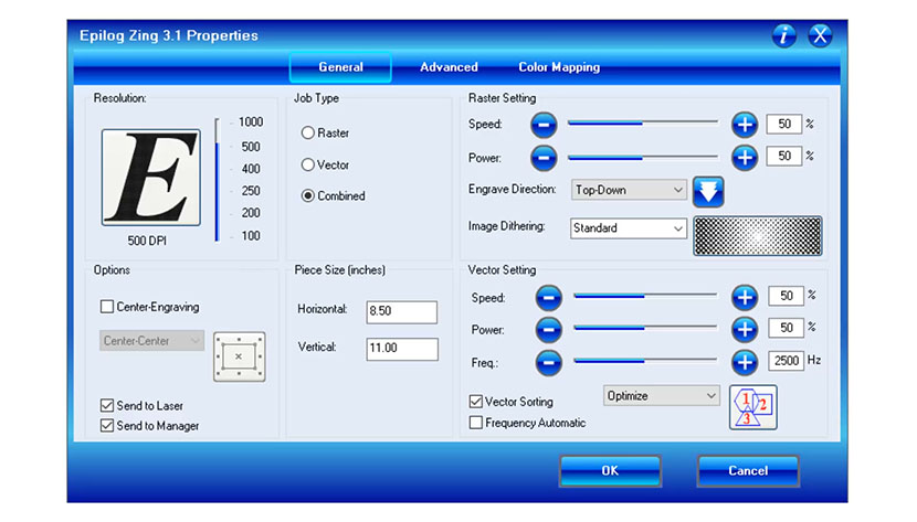 This was a basic overview of the Epilog Zing print driver. When you are done adjusting your settings, click the OK button to print the job to the laser or to send it to the Job Manager.