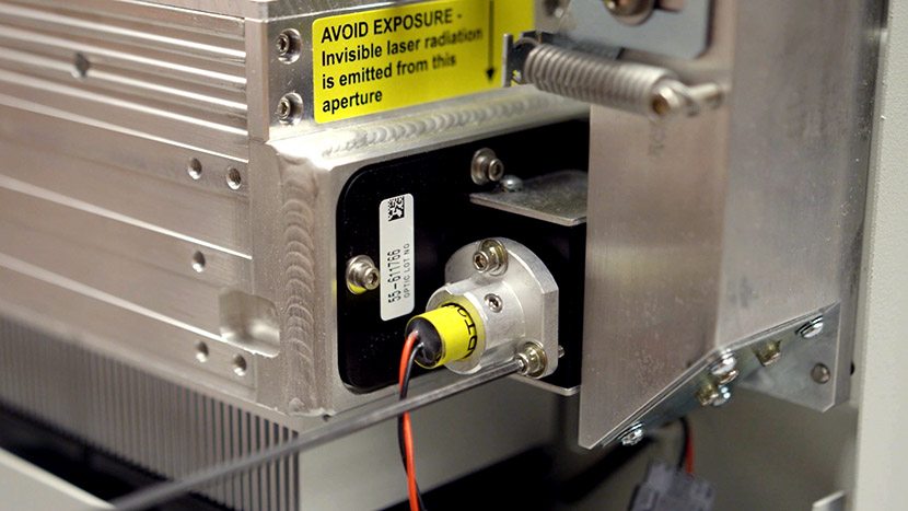 If the red dot pointer and the burn mark made by the laser are not aligned, locate the red dot pointer mount at the bottom of the periscope on the left side of the machine. Use a 3/32” hex key to adjust the alignment screws on the red dot pointer mount and align the red dot to the burn mark on the laser alignment target.