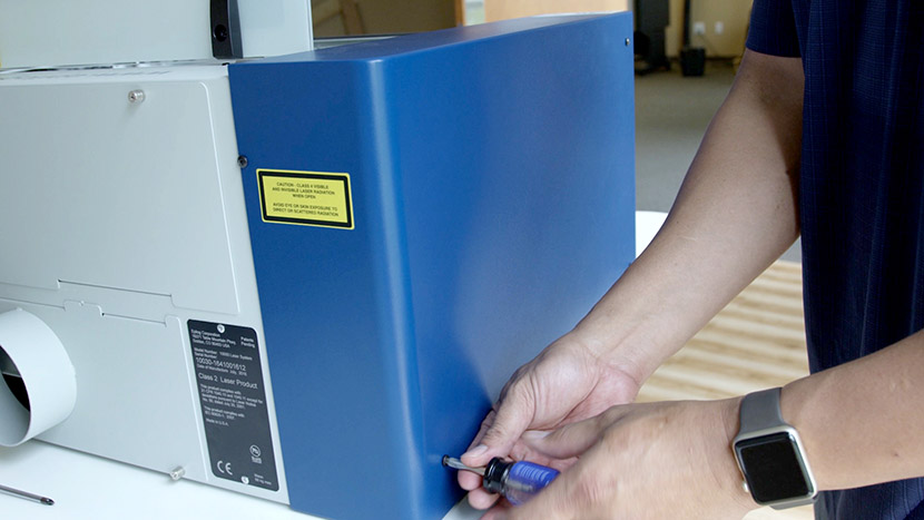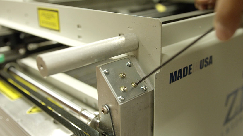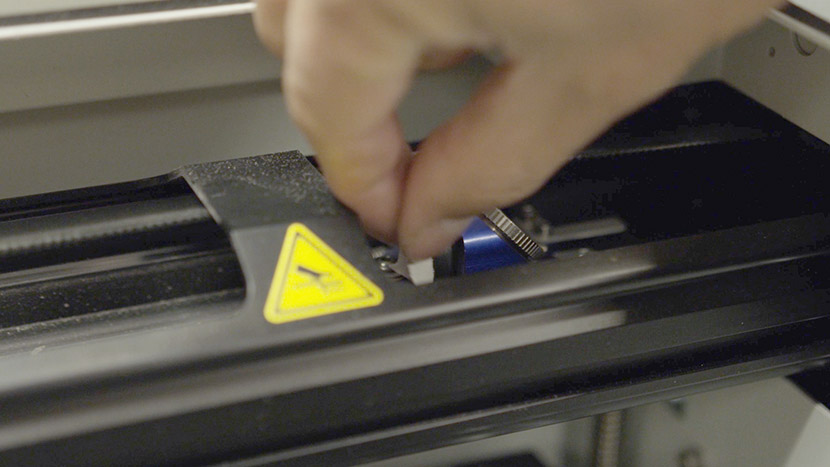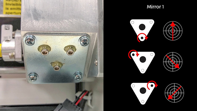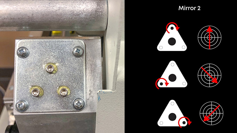 Use a 3/32” hex key to adjust the alignment screws on the mirror at the left end of the x-axis assembly.