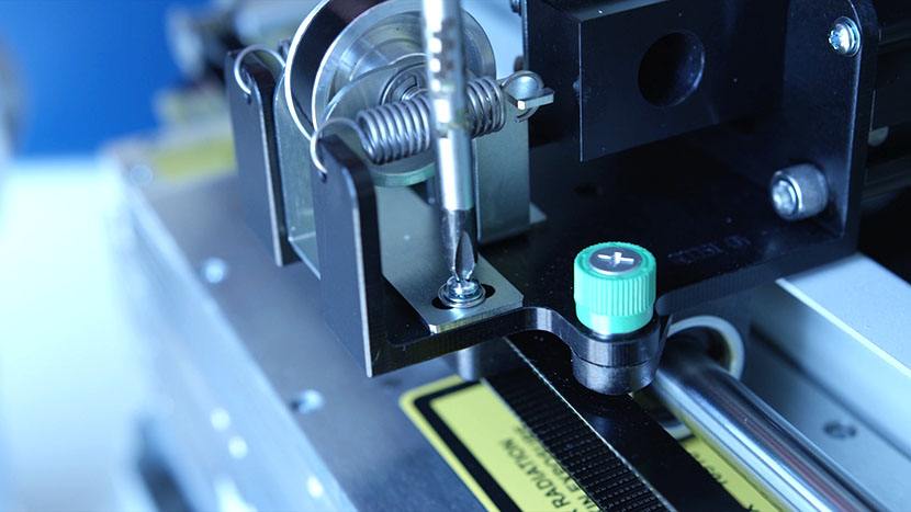 On the left side of the machine, loosen the two idler bracket screws and let the springs apply the tension to the x-axis belt. Ensure the idler bracket is square in the machine, then tighten the two screws again.