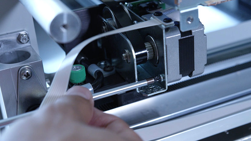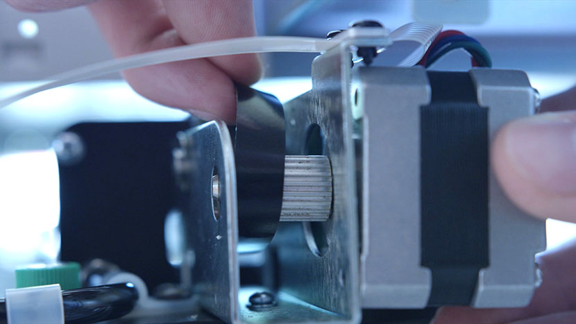 As you place the new motor in the opening in the x-axis, loop the belt over the x-motor pulley.